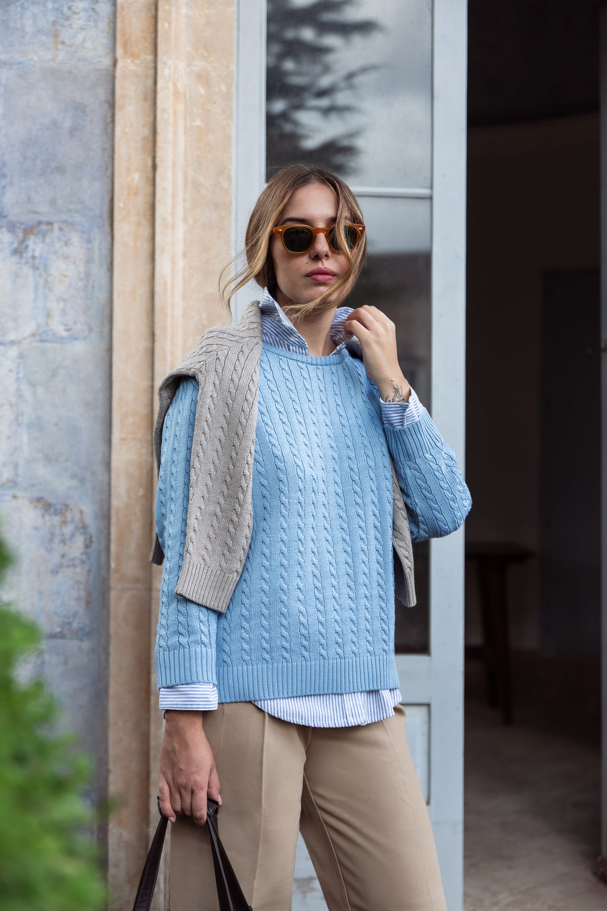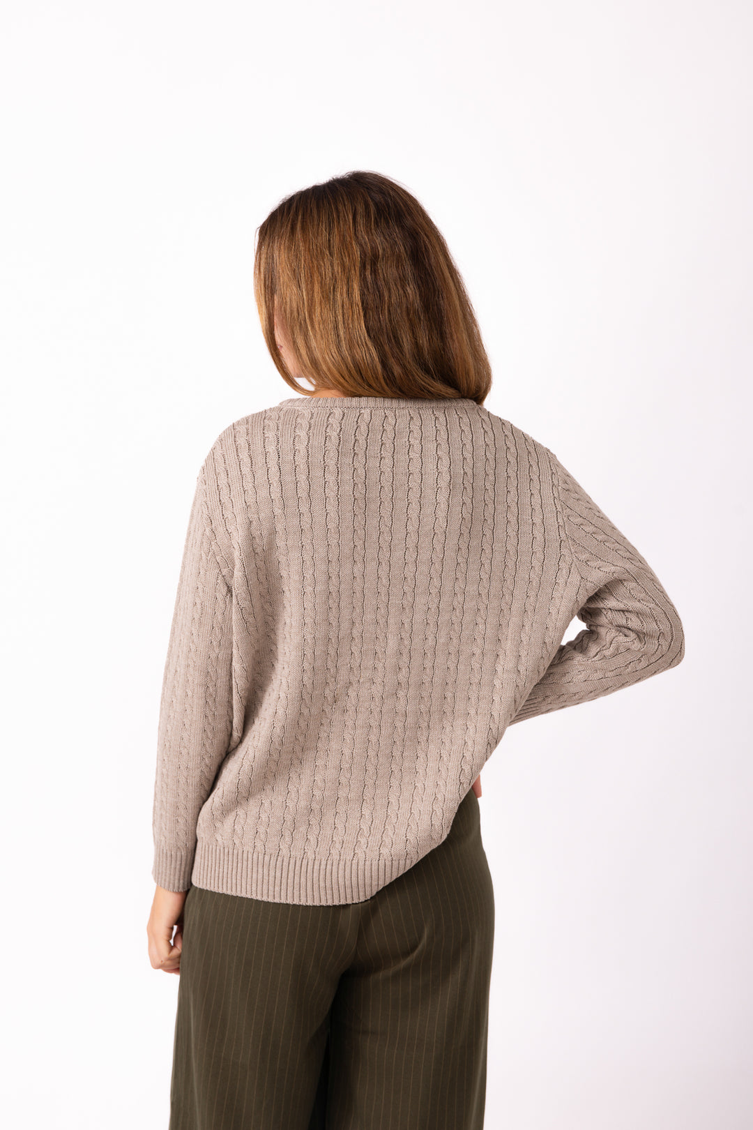 Realizzato in misto lana, presenta una lavorazione a treccia sottile che dona al capo un carattere sobrio ma ricercato. Il taglio è pensato per adattarsi con naturalezza a diverse fisicità: una vestibilità morbida per alcune, più essenziale per altre, sempre con una linea fluida che valorizza la figura.