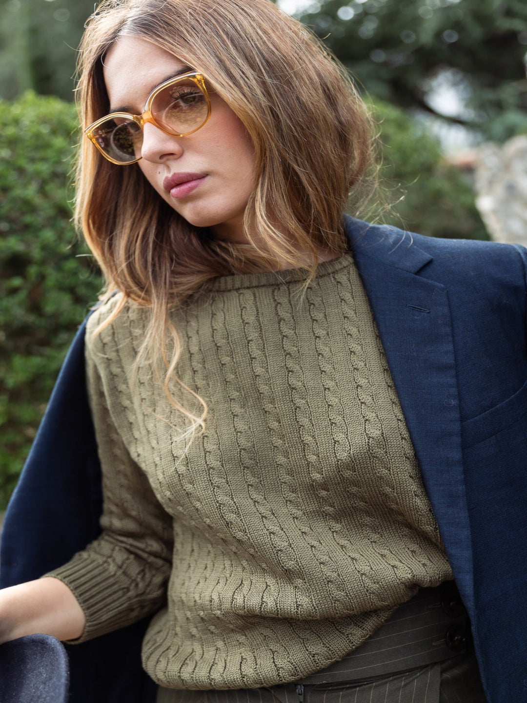 • Design: Maglia a treccia fine; girocollo; spalle scese